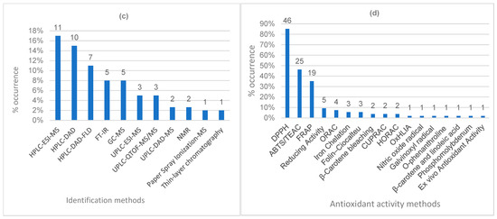 Seventeen antioxidant activity assays were identified across 54 articles in the portfolio (Figure 3d). Regarding the number of methods used in each study, 38 (68.5%) employed two or more methods, while 17 articles (31.5%) reported using only one method.