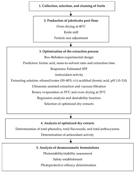 Based on the bibliometric analysis, we propose a methodological approach to extract jaboticaba peels and evaluate their antioxidant activity and photoprotective performance against UVR-induced damage (Figure 4). The scheme outlines five steps of the first phase of in vitro testing. It includes the production of jaboticaba peel flour and the extraction process optimization for phenolic compounds with antioxidant and photoprotective potential.