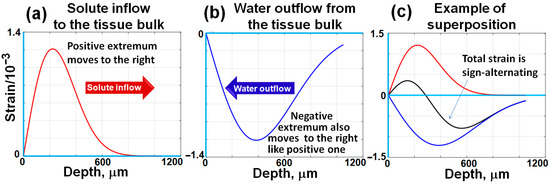 It should be pointed out that if the concentration of a considered substance in the solution (e.g., water) is less than concentration , then the same Equation (2) can be applied to describe the diffusional outflow of water from the tissue to the applied solution, in which the concentration of water is sufficiently low. Certainly, this primarily affects the portion of free and weakly bound water in the tissue (e.g., skin [72]). In such a case the diffusional water outflow also forms a gradually smoothed stepwise profile as schematically illustrated in Figure 1b, which is similar to Figure 1a, but the profile slope has the opposite sign. The penetrating agent causes a local increase in the osmotic pressure, so the tissue tends to equilibrate this excessive pressure and exhibits expansion (positive strain). On the contrary, the outflow of free and weakly bound water reduces the osmotic pressure associated with water, so the resulting deficit in osmotic pressure should cause tissue shrinking (negative straining).