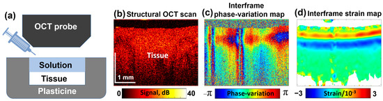 Schematic illustration of the tissue sample placed inside a protective plasticine shell with one side open for OCE examination (a); a typical structural OCT scan (b); color-coded map showing interframe phase variations (c); and the reconstructed map of dimensionless interframe strains (d), induced by application of a 30% water solution of glycerol. Figure (a) is adapted with permission from Ref. [61].
