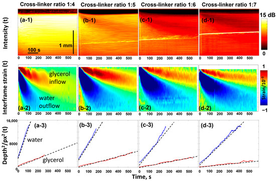 OCT-based visualization of the penetration of 50% glycerol in water solution in the polyacrylamide gel samples with various degrees of crosslinking. The top panels ((a-1)–(d-1)) show the evolution of the backscattering signal intensity as a function of time (the bright inclined line is an artifact caused by parasite optical reflections). The intensity is laterally averaged over the width of individual scans so that each vertical line corresponds to a specific time. Similarly, panels ((a-2)–(d-2)) show the time dependence of the osmotic strains, in the structure of which two extrema with alternating signs are formed by inflow of glycerol and outflow of water. Panels ((a-3)–(d-3)) show the linear dependences for the squared depths of the two extrema in agreement with the discussion of Equations (4) and (5). The figures are reproduced with permission from Ref. [61].