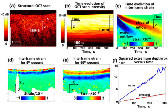 OCT-based visualization of the penetration of 30% glycerol in water solution in a homogeneous cartilage sample ex vivo. (a) is an example of a structural OCT scan. (b) presents the temporal variation in the OCT signal intensity similar to the top row in Figure 4 (notice that each vertical line in (b) corresponds to the intensity averaged over the total width of the structural scan, so the dynamic range of intensity in (b) gets smaller than in the structural OCT scan (a). Panel (c) shows the temporal variation in interframe osmotic strains containing two declining positive and negative “tongues” corresponding to glycerol inflow and water outflow, like for the gel samples in Figure 4. Panels (d,e) show examples of the spatial distribution of interframe strains for the 5th and 50th seconds of the penetration. Panel (f) demonstrates the linear time dependences for the squared depths of the positive and negative strain extrema (see Equation (5)). The slopes of the depth dependences of the tracked extrema according to Equation (5) indicate that and . Figures (b–f) are reproduced/adapted with permission from Ref. [61].
