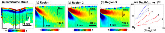 In Figure 3d, the interframe osmotically induced strains look as a pair of horizontal stripes having opposite signs that correspond to bell-shaped extrema in the vertical profiles, the origin of which was discussed in Section 2.1. The depth positions of these extrema gradually increase with time. Simultaneously, the profiles of these extrema gradually get smoother. By performing summation of interframe osmotic strains, total cumulative strains over larger time intervals can be found; in such a way quite large cumulative-strain magnitudes reaching 20–30% and even larger can be estimated as demonstrated in [71].
