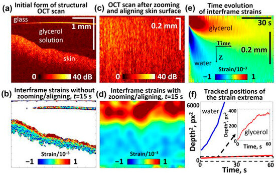 The applied solutions interact with the biological objects, inducing deformation that depends on their osmotic concentration relative to the tissue—a hypertonic solution induces tissue dehydration and shrinkage, whereas a hypotonic solution promotes swelling due to osmotic water influx [61]. OCE has been utilized to study changes in the mechanical properties of tissues treated with various chemicals, including clearing agents and dehydrating or preserving solutions [62,63,64]. For instance, cartilage exposed to 20% glucose showed a gradual increase in Young’s modulus over 140 min, while higher concentrations (40% and 70%) led to a marked decrease in stiffness. During impregnation with a moderately concentrated glucose solution, a non-monotonic mechanical response was observed: an initial rise in the Young’s modulus was followed by a transient drop, then a gradual rise again [64]. Arteries treated with hyperosmotic propylene glycol (60% and 80%) exhibited increased stiffness and heterogeneous transverse deformation—shrinkage of the intima and adventitia with concurrent swelling of the media—although only steady-state strain was evaluated [62]. Additionally, corneal swelling and deswelling kinetics under 20% dextran treatment were shown in [63]. Taking the above-mentioned advantages into consideration, OCE is increasingly explored in cosmetology for assessing skin rejuvenation following cosmetic treatments like laser therapies, chemical peels, and anti-aging procedures [65,66]. Even though these measurements could provide insights for optimizing cosmetic/medical topical interventions and tracking treatment outcomes, OCE has never been used to determine the penetration depth into the skin and the effect of cosmetic/medical formulations on the skin.