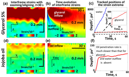 For comparison with the results of the discussed OCE-based visualization of diffusional penetration, similar experiments were repeated with jojoba oil and 5% glycerol in water solution using skin samples which, in contrast to the example in Figure 7, were not preliminary stored in saline solution to enable similar conditions as in the study [98] and to exclude possible distortions due to hydrophobic properties of oil. The results of these comparative experiments are shown in Figure 8.