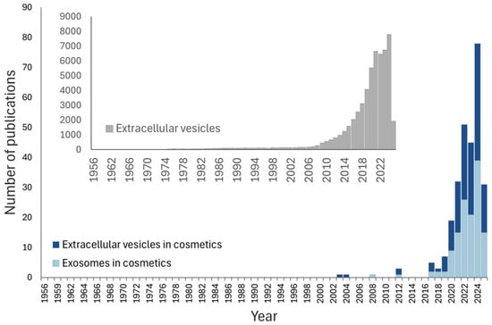 Figure 1. Number of publications about extracellular vesicles available on the PubMed database. Graphics clearly show an increased interest in EVs, particularly from 2010 (gray bars). Despite the reduced number of publications about EVs in cosmetology, it is possible to verify an increasing interest in these vesicles since 2020 (blue bars). Graphs obtained using the total number of publications available on the PubMed database until 17 March 2025.