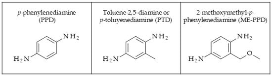 Chemical structures of the hair dye primary intermediates p-phenylenediamine (PPD), p-toluenediamine (PTD), and 2-methoxymethyl-p-phenylenediamine (ME-PPD).