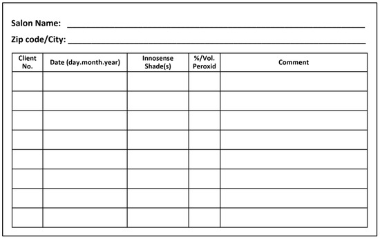 The participating hairdressers had to perform the hair color applications as usual and complete record cards (Figure 2). Thus, we managed to capture data from a close follow-up of more than 500 clients and almost 2500 hair color applications.