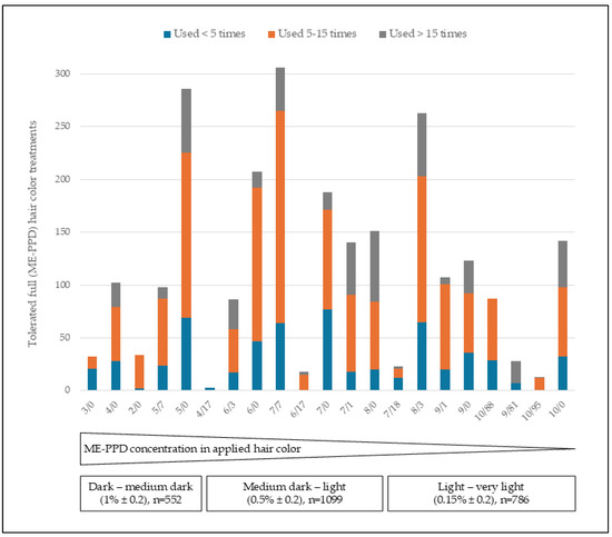 During the observation period, out of 491 individuals, 323 individuals had used the hair color 1–5 times, 141 individuals 5–15 times, and 27 individuals had used the ME-PPD-containing hair color more than 15 times. A comparison with the frequency of use of other alternative hair dye products cannot be made because corresponding data are not available. When analyzing the frequency of usage in more detail, we found that individuals with ME-PPD-containing hair color applications more often than 15 times were not only among users of shades with light tone levels, but also among users of shades with dark tone levels, which contain higher concentrations of ME-PPD than light shades. These data also indicate a good long-term tolerability of hair color shades with higher ME-PPD concentrations (Figure 3).