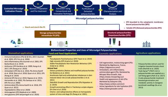 Flowchart illustrating key steps in microalgal polysaccharide production and extraction and their biofunctional applications, with examples from biomedical, food, cosmetic, and agricultural fields (Ps: polysaccharides, PSs: sulfated polysaccharides, EPSs: exopolysaccharides, and IPSs: intracellular polysaccharides) [9,37,38,39,40,41,42,43,44,45,46,47,48,49,50,51,52,53,54,55,56,57,58,59,60,61,62,63,64,65,66,67].