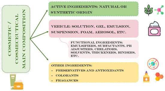Figure 2 summarizes the main composition of cosmetics and cosmeceuticals.