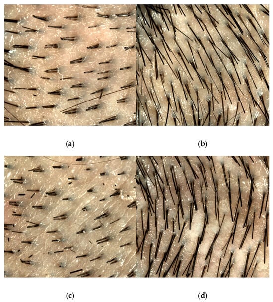TrichoScan images (before/after NMN supplementation).(a) Before NMN supplementation, Day 0 (shaving day); (b) Before NMN supplementation, Day 3 after shaving; (c) After NMN supplementation, Day 0 (shaving day); (d) After NMN supplementation, Day 3 after shaving.