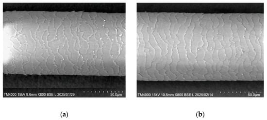 SEM images showing changes in hair cuticle and diameter pre- and post-NMN supplementation. (a) Before NMN supplementation, Hair diameter 74.7 µm; (b) After NMN supplementation, Hair diameter 84.1 µm.