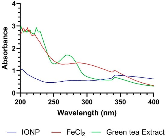 Spectra of 1 M iron nanoparticle (IONP) (blue), iron(II) chloride (red), and Green tea extract (green).