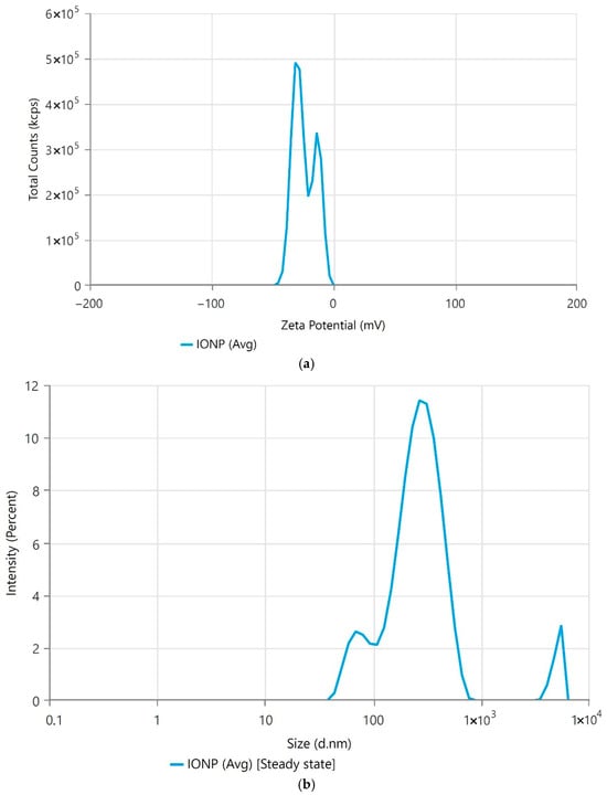 The zeta potential of the IONPs was also measured using the same Malvern Zetasizer Nano ZS instrument. Samples were prepared by diluting the IONP dispersion in deionized water, and measurements were performed at 25 ± 2 °C. The zeta potential, which indicates the electrostatic potential at the shear plane of the particles, was calculated from the electrophoretic mobility of the particles. All measurements were carried out in triplicate, and the mean zeta potential value was recorded.
