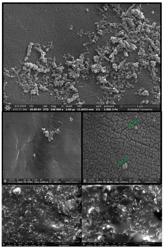 SEM image displays a highly magnified view of a sample with irregularly shaped and sized particles (Figure 3a–c). Figure 3a (100,000×) presents a densely packed surface of interconnected particles, while Figure 3b (1000×) illustrates a lower-magnification overview of nanoparticle deposition. In Figure 3c, green arrows highlight the approximate particle dimensions, confirming the presence of nanoscale entities. The iron particles appear to be agglomerated, forming clusters and networks on the surface. The texture of the background surface indicates a fine granular structure, which contrasts with the larger, more distinct particles. The analysis revealed a wide size distribution, with most particles being relatively small but larger than 10 nm, highlighting the heterogeneity in particle size and distribution within the sample. Although some aggregates exceeded 100 nm, individual primary particles observed in SEM images were below 100 nm, justifying the nanoparticle designation. Figure 3d,e represent SEM images of the Pickering emulsion containing IONPs. The nanoparticles appear embedded within the emulsion matrix, indicating successful integration and potential interfacial stabilization.