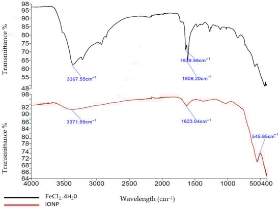 The provided FTIR spectra compare the FeCl2.4H2O (black) with iron nanoparticles synthesized using green synthesis methods (red). The FeCl2.4H2O spectrum exhibits characteristic peaks, such as the broad absorption band at 3367.55 cm−1, indicating O-H stretching vibrations due to water molecules. Additionally, peaks at 1638.96 cm−1 and 1609.20 cm−1 correspond to H-O-H bending vibrations of water (Figure 4).
