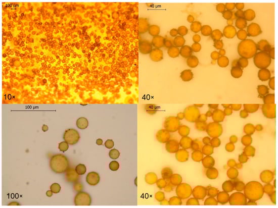 The pH values of the obtained formulations were found to be between 5.537 and 5.716, which are close to the pH of the skin, making them suitable for use. Subsequently, a microscopic examination of the selected PE-1 formulation was conducted. Emulsions were stored at room temperature (25 ± 2 °C) under ambient light and observed for phase separation, creaming, and visual changes (Figure 5). The final emulsion exhibited a characteristic red-brown color due to iron oxide content. This color may pose a challenge for its acceptance in cosmetic or dermatological topical formulations, where product appearance and consumer preference for clear or skin-toned products are often critical for market appeal.