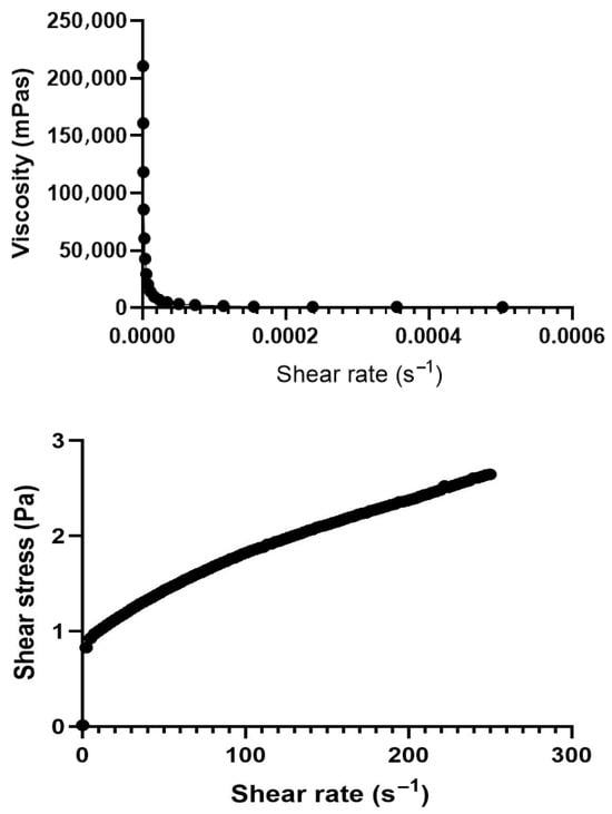 Figure 5 shows how viscosity changes with varying shear rates, typical for non-Newtonian fluids. At low shear rates, the viscosity is high, indicating a strong resistance to flow. As the shear rate increases, the viscosity decreases significantly, demonstrating a shear-thinning behavior [42]. According to Figure 5, our formulation shows plastic-type fluid. The study conducted by Ansari et al. investigated the velocity distribution and profile shape of laminar flows for both Newtonian and non-Newtonian fluids in mini-channels, focusing on how these properties are influenced by shear stress and shear rate using the Ostwald-de Waele power law model [43]. This means the fluid becomes less viscous and flows more easily when subjected to higher shear rates. The curve eventually levels off, indicating that further increases in shear rate do not significantly reduce viscosity. This behavior is important for applications in pharmaceuticals, cosmetics, and food products, where understanding how a substance flows under different conditions is crucial for formulation and processing.