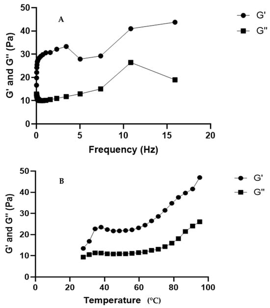 Figure 7A illustrates the oscillatory rheology data, showing the relationship between storage modulus (G’) and loss modulus (G”) across different frequencies. The storage modulus (G’), which reflects elastic or solid-like behavior, initially increases with frequency, peaks, and then continues to rise, indicating enhanced solid-like properties at higher frequencies [48]. In contrast, the loss modulus (G”), representing the viscous or liquid-like behavior, increases more slowly, peaks around 10 Hz, and then slightly decreases, suggesting dominant viscous behavior at lower frequencies. The bottom figure shows the storage and loss moduli as a function of temperature. The storage modulus (G’) increases with temperature after an initial rise and plateau, indicating greater rigidity at higher temperatures. Similarly, the loss modulus (G”) also increases but more gradually, suggesting the material maintains some viscous properties even as it becomes more solid-like. These behaviors, typical of viscoelastic materials, align with recent studies highlighting the impact of frequency and temperature on the rheological properties of complex fluids [49]. These behaviors align with findings from a recent study of Moch et al., which investigated the temperature-dependent rheological properties of glycerol, a glass-forming material. The study employed oscillatory rheology to monitor structural recovery and observed that both the storage and loss moduli exhibited temperature-dependent changes, similar to the trends shown in Figure 7B [50].