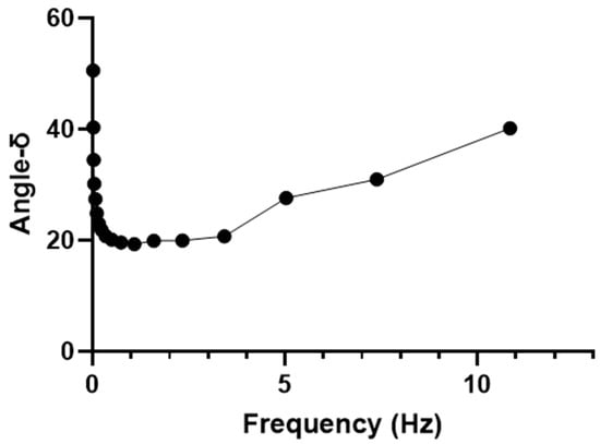 Figure 8 illustrates the variation in phase angle (δ) with frequency in an oscillatory rheology experiment. The phase angle, δ, represents the lag between the applied strain and the resulting stress, providing insights into the viscoelastic behavior of the material. At low frequencies, the phase angle is high, indicating a significant viscous response. As the frequency increases, the phase angle decreases sharply, reaching a minimum (~2 Hz), which suggests a transition towards more elastic behavior [47,51]. Beyond this point, the phase angle begins to increase again, indicating a complex interplay between elastic and viscous properties at higher frequencies.