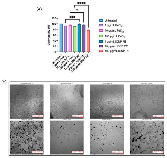 This reduction is likely due to the excipients rather than iron toxicity. The emulsion formula comprised 10% IONP, 30% coconut oil, and 60% green extract. At the 100 µg/mL FeCl2 dose, the concomitant concentrations are approximately 300 µg/mL coconut oil and 600 µg/mL green extract.