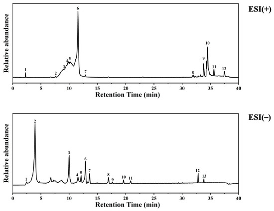 Chromatographic analysis was carried out on a Vanquish UHPLC system (Thermo Fisher Scientific, Erlangen, Germany) equipped with an ACQUITY UPLC HSS T3 column (Waters, Beijing, China) (2.1 mm × 100 mm, 1.8 μm) maintained at 35 °C. The mobile phase consisted of 0.1% formic acid in water (eluent A) and 0.1% formic acid in acetonitrile (eluent B), delivered at a flow rate of 0.3 mL/min.