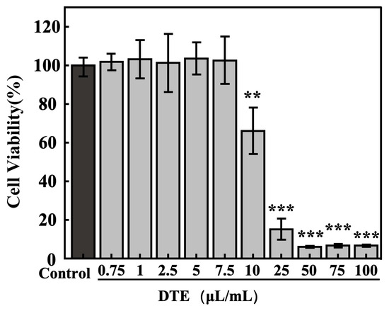Effect of DTE on cell viability of B16 cells. All assays were performed in triplicate. Statistical analysis was performed by ANOVA. Error bars indicate the standard deviation of three independent tests in triplicate. (**, *** indicate p < 0.01, 0.001, vs. Control group).