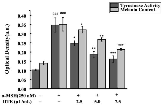 To assess the impacts of DTE on melanin content and tyrosinase activity, the B16 cells were treated with 2.5, 5.0, and 7.5 μL/mL of DTE or stimulated with 250 nM of α-MSH for 24 h. As was observed, the melanin accumulation was greatly reduced and the tyrosinase activity was observably decreased in B16 cells (Figure 3). Specifically, 7.5 μL/mL of DTE significantly decreased the tyrosinase activity by 46%, and 7.5 μL/mL of DTE also significantly decreased the melanin content by 60%. These results showed that DTE can inhibit melanin content and tyrosinase activity, indicating its anti-melanogenesis effect.