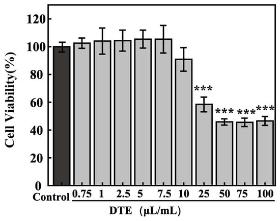 The concentration toxicity relations of DTE on HaCaT cells were determined using MTT assays. As shown in Figure 4, the cell survival ratios of HaCaT cells were greater than 95% at lower concentrations of DTE from 0.75 to 7.5 μL/mL, and the cell viabilities were less than 90% at higher concentrations from 10.0 to 100.0 μL/mL. Therefore, we chose the following concentrations (0.75–7.5 μL/mL of DTE) to investigate the influences of DTE on HaCaT cells in the subsequent experiments.