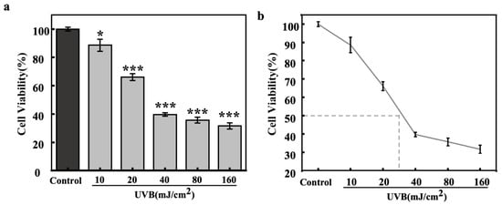 Effect of UVB dosages on cell viability of HaCaT cells (bar chart (a), dot line chart (b)). All assays were performed in triplicate. Statistical analysis was performed by ANOVA. Error bars indicate the standard deviation of three independent tests in triplicate. (*, and *** indicate p < 0.05, and 0.001, vs. Control group).