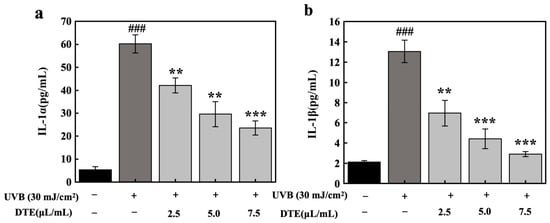 Effect of DTE on IL-1α (a) and IL-1β (b) content in UVB-irradiated HaCaT cells. All assays were performed in triplicate. Statistical analysis was performed by ANOVA. Error bars indicate the standard deviation of three independent tests in triplicate. (### indicate p < 0.001 vs. Control group, **, *** indicate p < 0.01, 0.001 vs. Model group).