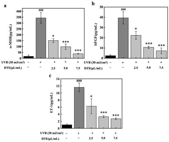 Effect of DTE on α-MSH (a), bFGF (b), and ET-1 (c) content in UVB-irradiated HaCaT cells. All assays were performed in triplicate. Statistical analysis was performed by ANOVA. Error bars indicate the standard deviation of three independent tests in triplicate (### indicate p < 0.001 vs. Control group, *, and *** indicate p < 0.05, and 0.001 vs. Model group).
