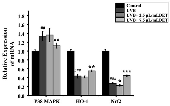 Effect of DTE (μL/mL) on the mRNA level of p38 MAPK (a), Nrf2 (b), and HO-1 (c) in UVB-irradiated HaCaT cells. All assays were performed in triplicate. Statistical analysis was performed by ANOVA. Error bars indicate the standard deviation of three independent tests in triplicate (##, ### indicate p < 0.01, 0.001 vs. Control group, *, **, *** indicate p < 0.05, 0.01, 0.001 vs. model group).