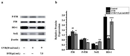 Western blot assay of P38, P-P38, Nrf2, and HO-1 (a) and effect of DTE (μL/mL) on the protein level of P38, P-P38, Nrf2, and HO-1 (b) in UVB-irradiated HaCaT cells. Statistical analysis was performed by ANOVA. Error bars indicate the standard deviation of three independent tests in triplicate (##, ### indicate p < 0.01, 0.001 vs. Control group, *, **, and *** indicate p < 0.05, 0.01, and 0.001 vs. Model group).