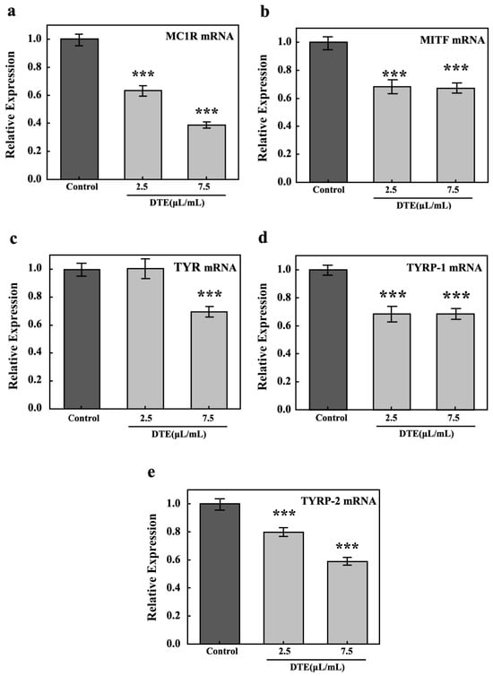 Our previous investigation revealed that DTE effectively attenuated melanogenesis in B16 cells. Further mechanistic studies demonstrated that α-MSH engages with melanocortin 1 receptor (MC1R) on B16 cells, establishing one of the key pathways of melanin synthesis. MC1R activation in B16 cells was found to directly modulate microphthalmia-associated transcription factor (MITF) expression and activity, which governed the transcriptional regulation of tyrosinase (TYR), tyrosinase-related protein 1 (TYRP-1), and tyrosinase-related protein 2 (TYRP-2)—essential components of the melanogenic regulatory network [27]. Analysis via RT-PCR revealed that the mRNA expressions of melanin-producing markers (MC1R, MITF, TYR, TYRP-1, and TYRP-2) were significantly downregulated under 2.5 or 7.5 μL/mL of DTE treatment, indicating that the gene expression of the genuine melanin regulatory network had been inhibited.