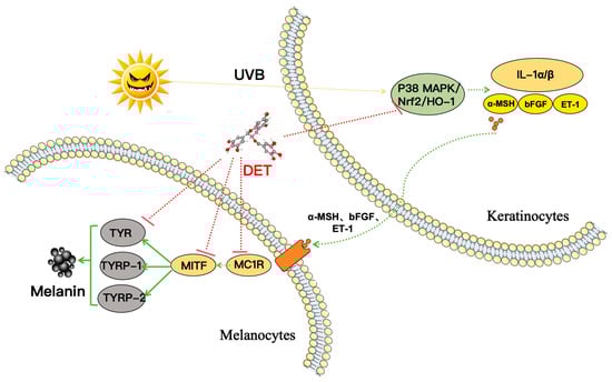 In summary, these RT-PCR findings suggested DTE reduced PIH by inhibiting the expression of the P38 MAPK pathway and upregulating the expression of the Nrf2/HO-1 pathway, thereby decreasing the release of inflammatory factors (IL-1α, IL-1β) and paracrine melanogenic factors (ET-1, bFGF, and α-MSH). Meanwhile, DTE decreased the binding of α-MSH to MC1R receptors, inhibited the activation of MITF, and then reduced TYR, TYRP-1, and TYRP-2 expression, ultimately achieving multi-target action and leading to diminished melanin production (Figure 11).