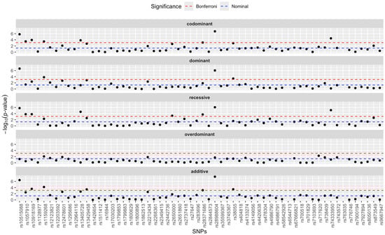 Other variants showed nominal or model-specific associations but did not survive multiple-testing correction, including loci in HNF1A-AS1 (other models), C11orf30/LRRC32, TLR4, SLCO1B1, PNPLA3, SOAT1, SERPINB7, CYP19A1, FLG-AS1, and FLG. Classical inflammatory cytokine genes (IL1B, IL10, TNF) did not show significant single-locus effects in this dataset. The distribution of signals across models is depicted in Figure 1, where the SNPs listed above can be seen exceeding the Bonferroni line. Taken together, the single-variant results highlight biologically coherent axes that align with the rest of the study: retinoid metabolism (CYP3A4, CYP2C9), nuclear receptor and PI3K signalling (RXR, PIK3R1), endocrine regulation (LHCGR, THADA), tissue remodelling (TGF-β2, FST), and follicular development (WNT10A). All single-locus p-values under each inheritance model, including Bonferroni-adjusted results, are provided in Supplementary File S1.