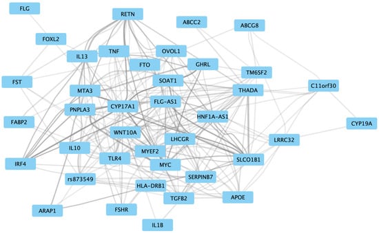 Beyond immunity and barrier function, the interaction network also revealed modules linked to endocrine and metabolic regulation. Genes such as FSHR, LHCGR, CYP17A1, and CYP19A1 connect reproductive signalling with inflammatory and lipid pathways [16,17], reflecting the well-established influence of androgens on sebaceous gland activity. Lipid-related loci such as PNPLA3, TM6SF2, and APOE were repeatedly connected to inflammatory and transcriptional regulators, reinforcing the idea that sebum composition and lipid handling are genetically intertwined with immune activation in acne. These multi-domain connections provide a more nuanced view than single-gene approaches, capturing the interplay between sebaceous, immune, and barrier systems.