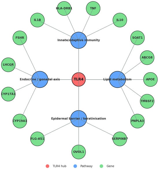 TLR4-centred interaction map grouped by functional pathways. The central red node is TLR4. Blue nodes are pathway categories derived from the interaction network and ClueGO grouping (innate/adaptive immunity; lipid metabolism; epidermal barrier–keratinisation; endocrine/gonadal axis). Green nodes list representative interacting genes from the selected SNP–SNP pairs within each pathway. Grey edges connect TLR4 → pathway and pathway → genes (visual summary; edge thickness not scaled).