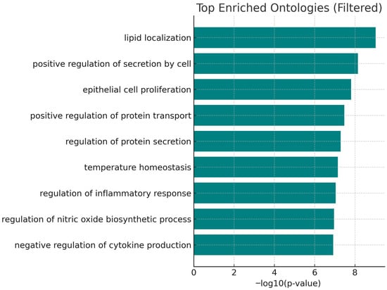 Bar graph showing the top 12 Gene Ontology (GO) biological processes identified by ClueGO after excluding broad reproductive categories. Enrichment significance is displayed as −log10(p) for readability. The leading processes—lipid localisation and transport, keratinisation and epidermal differentiation, inflammatory regulation including cytokine signalling, nitric oxide biosynthesis, and endocrine development—highlight the convergence of barrier, metabolic, and immune mechanisms in severe acne. Analysis parameters: GO Biological Process in ClueGO/CluePedia with the whitelist-mapped genes as background; multiple testing controlled by Benjamini–Hochberg false discovery rate (FDR). Inference was based on q values, and enrichments are interpreted as suggestive under exploratory thresholds.