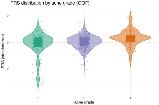 The standardised PRS distribution demonstrated a clear upward shift with increasing acne severity (Figure 5). Median values were lowest for Grade 1, intermediate for Grades 2–3, and highest for Grade 4, with the Grade 4 group showing a visibly wider spread. This monotonic trend was accompanied by a moderate separation between severe and non-severe groups, reflected in the overall ordinal discrimination (c-index = 0.574) and macro AUC = 0.618 across binary clinical contrasts. When focusing on the clinically relevant comparison between severe cases and the rest, the PRS yielded an AUC of 0.679 for Grade 4 versus Grades 1/2–3. This level of discrimination, while modest, was consistent across all tested contrasts, suggesting that the genetic component captured by the PRS provides measurable but not exclusive predictive information. Because the models were intentionally unadjusted for clinical covariates (sex, age, BMI, treatment), these discrimination metrics quantify the genetic signal in isolation. As such, they likely represent a lower bound on attainable performance; incremental gains are expected when genetics is integrated with clinical and demographic predictors in external validation.