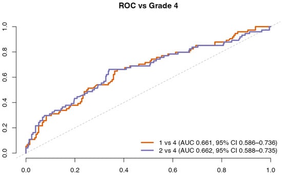 Receiver operating characteristic (ROC) curves for discrimination between Grade 4 and Grade 1 (blue) and between Grade 4 and Grade 2 (orange), using the predicted probability of Grade 4 as the score.