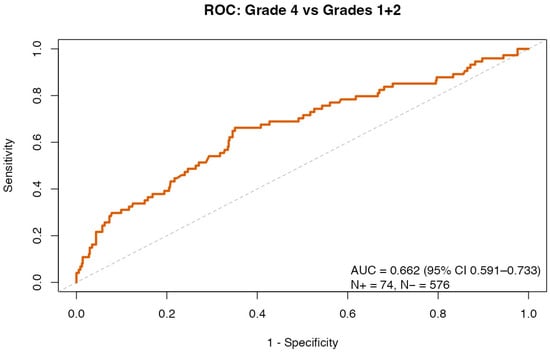 Receiver operating characteristic (ROC) curve for discrimination between Grade 4 and the combined Grades 1 and 2, using the predicted probability of Grade 4 as the score.