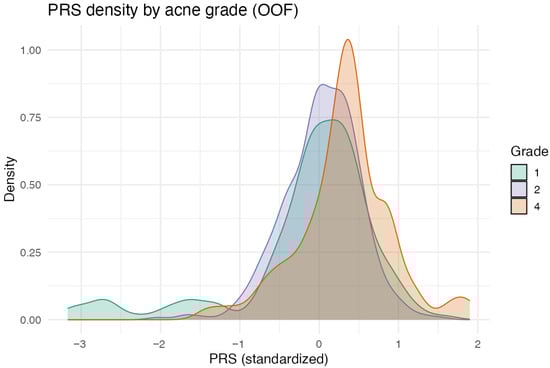 Density plots of standardised Polygenic Risk Score (PRS) stratified by acne severity grade, illustrating the rightward shift in distribution for severe cases.