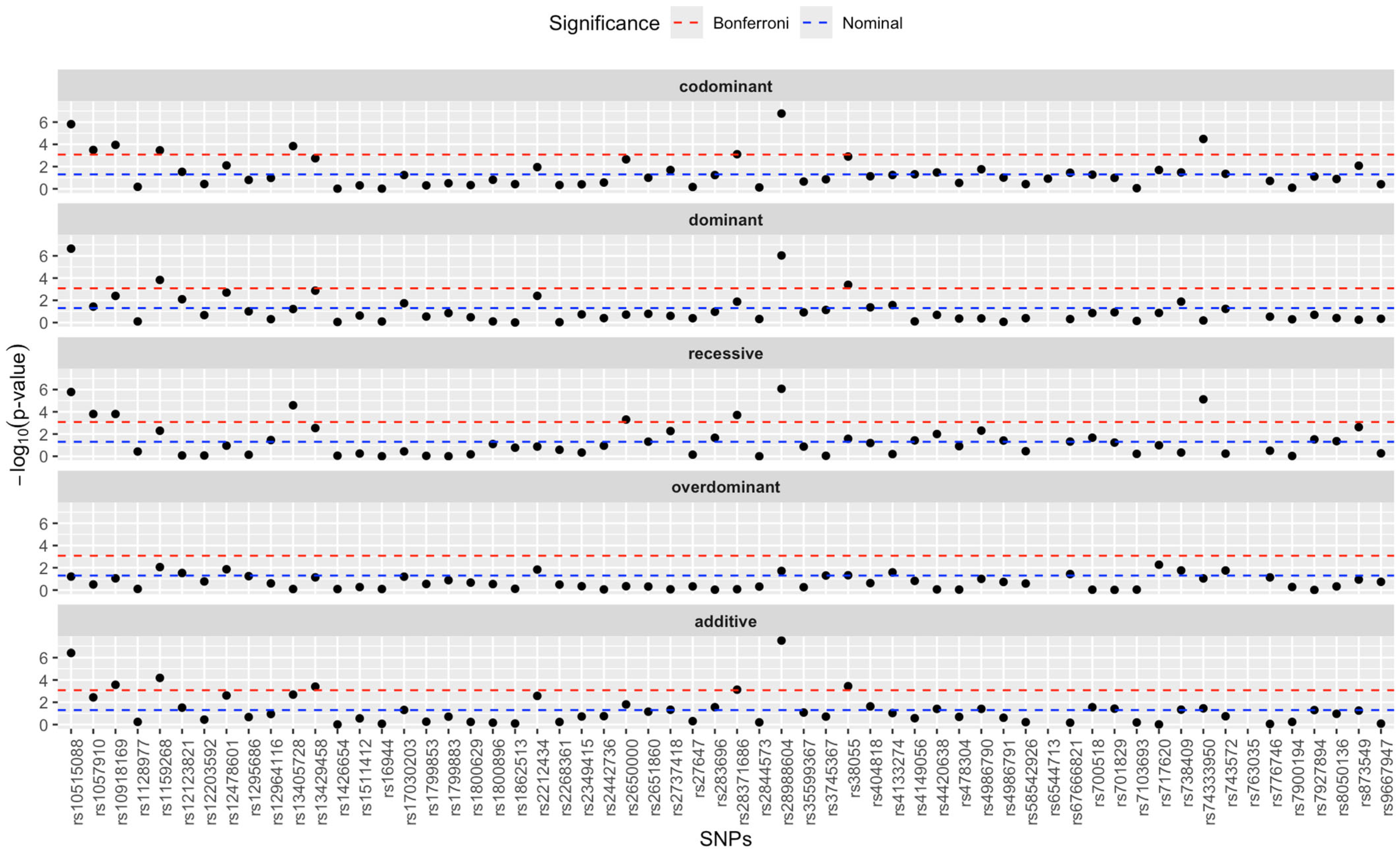 - González, J.R.; Armengol, L.; Solé, X.; Guinó, E.; Mercader, J.M.; Estivill, X.; Moreno, V. SNPassoc: An R Package to Perform Whole Genome Association Studies. Bioinformatics 2007, 23, 654–655. [Google Scholar] [CrossRef]