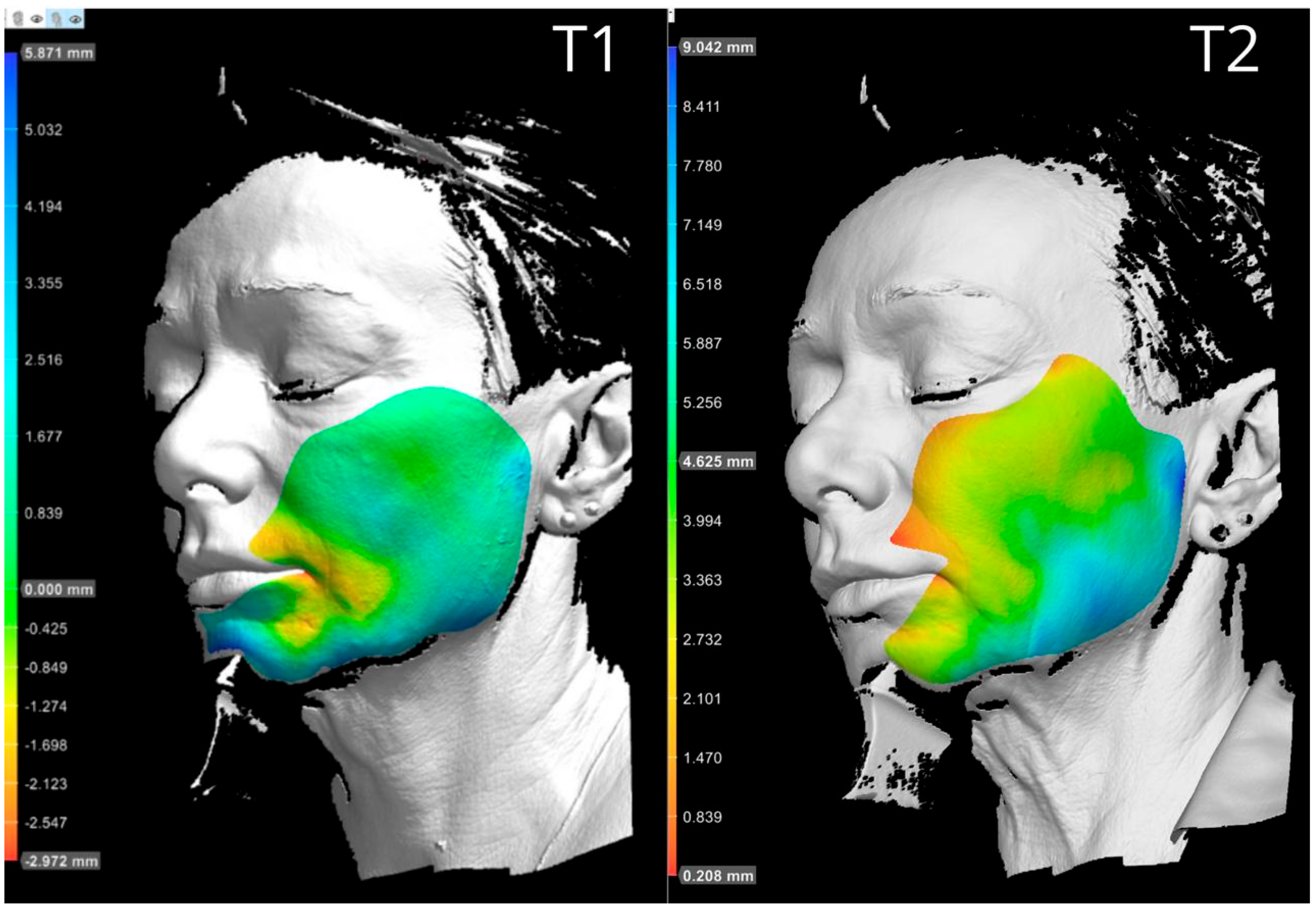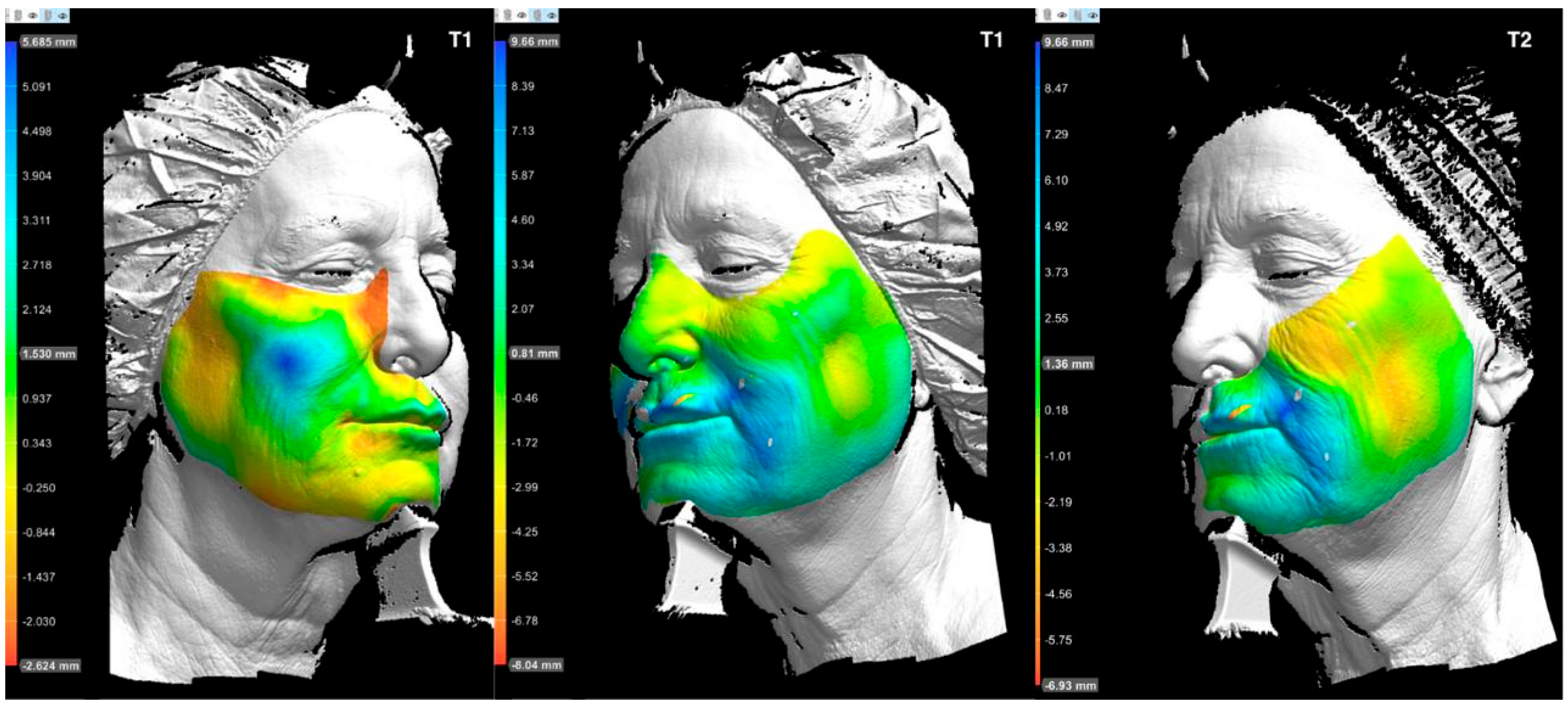 Scheme 2) demonstrated a pronounced lifting and projection effect. Blue regions in the midface indicate increased projection, while the appearance of yellow and red tones in the lower third may reflect upward volumetric displacement, suggestive of an anti-gravitational “lifting” effect.
