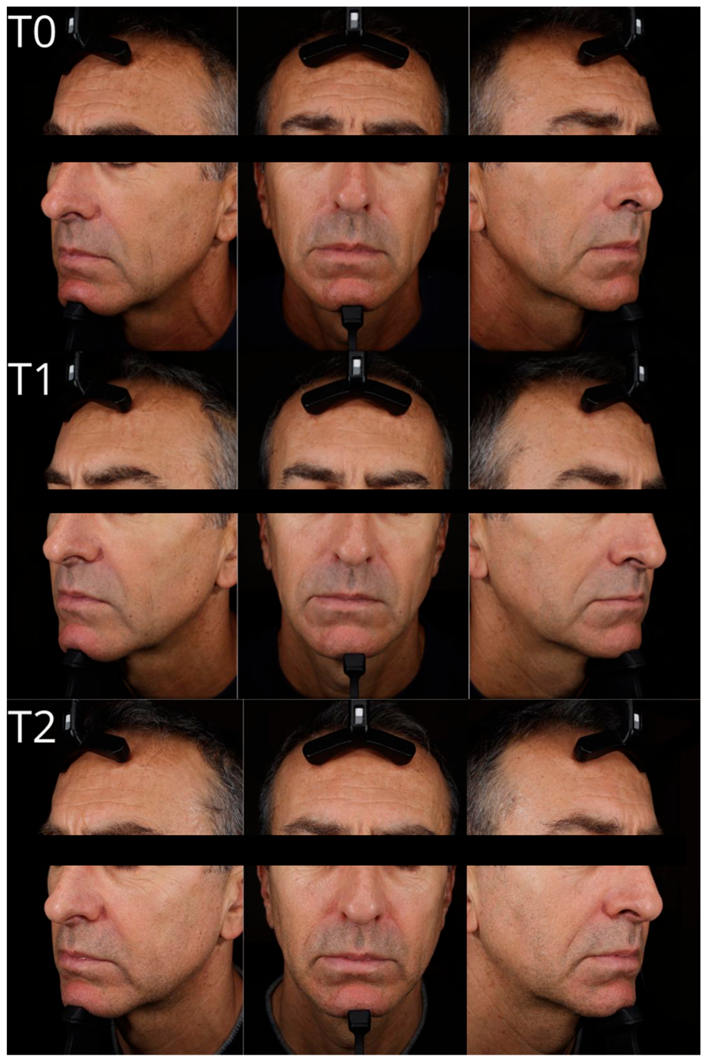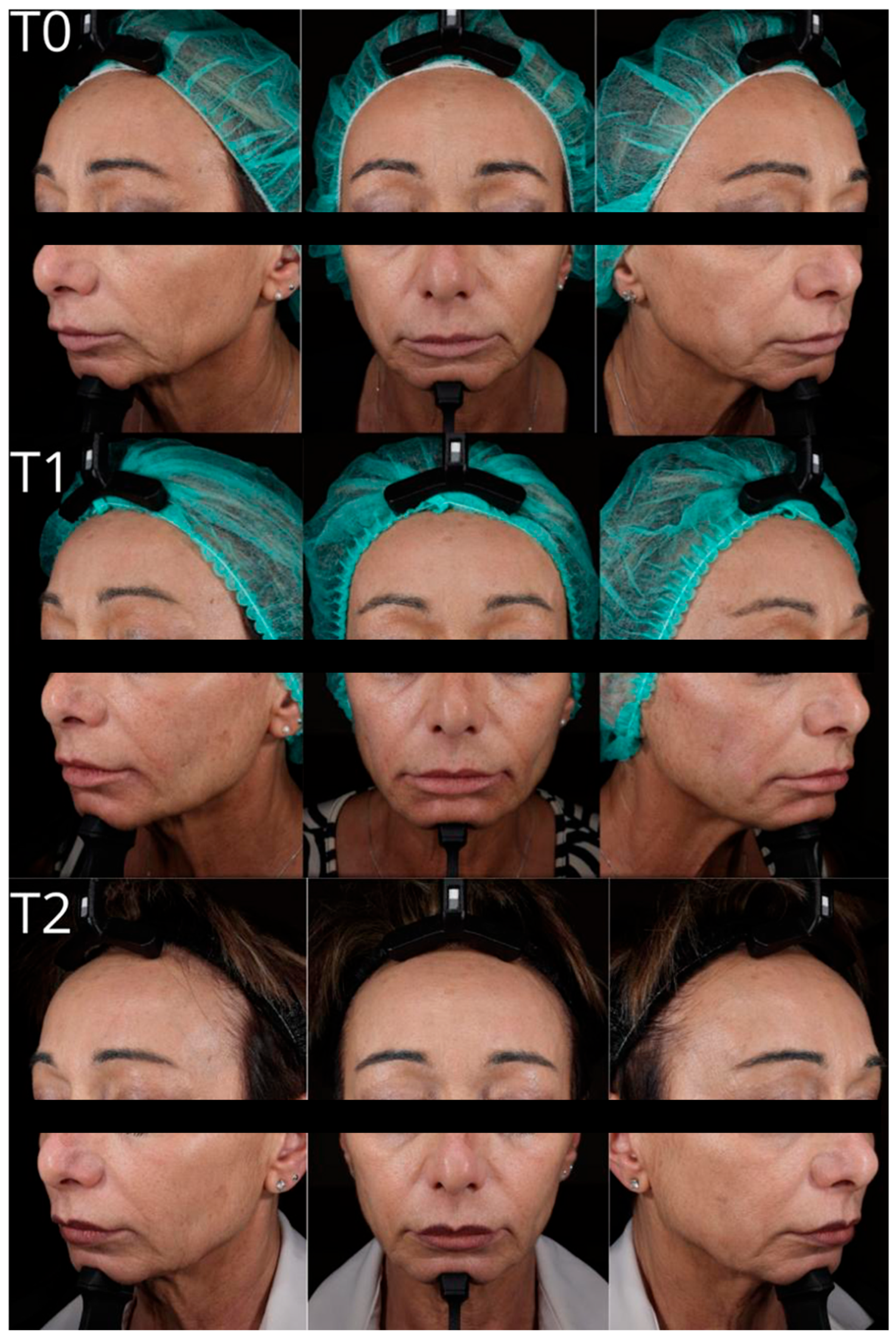 Clinical and instrumental assessments were performed at baseline (T0), 2 months post-treatment (T1), and 9 months post-treatment (T2) to evaluate filler effectiveness, duration of volumetric correction, and improvements in skin quality (