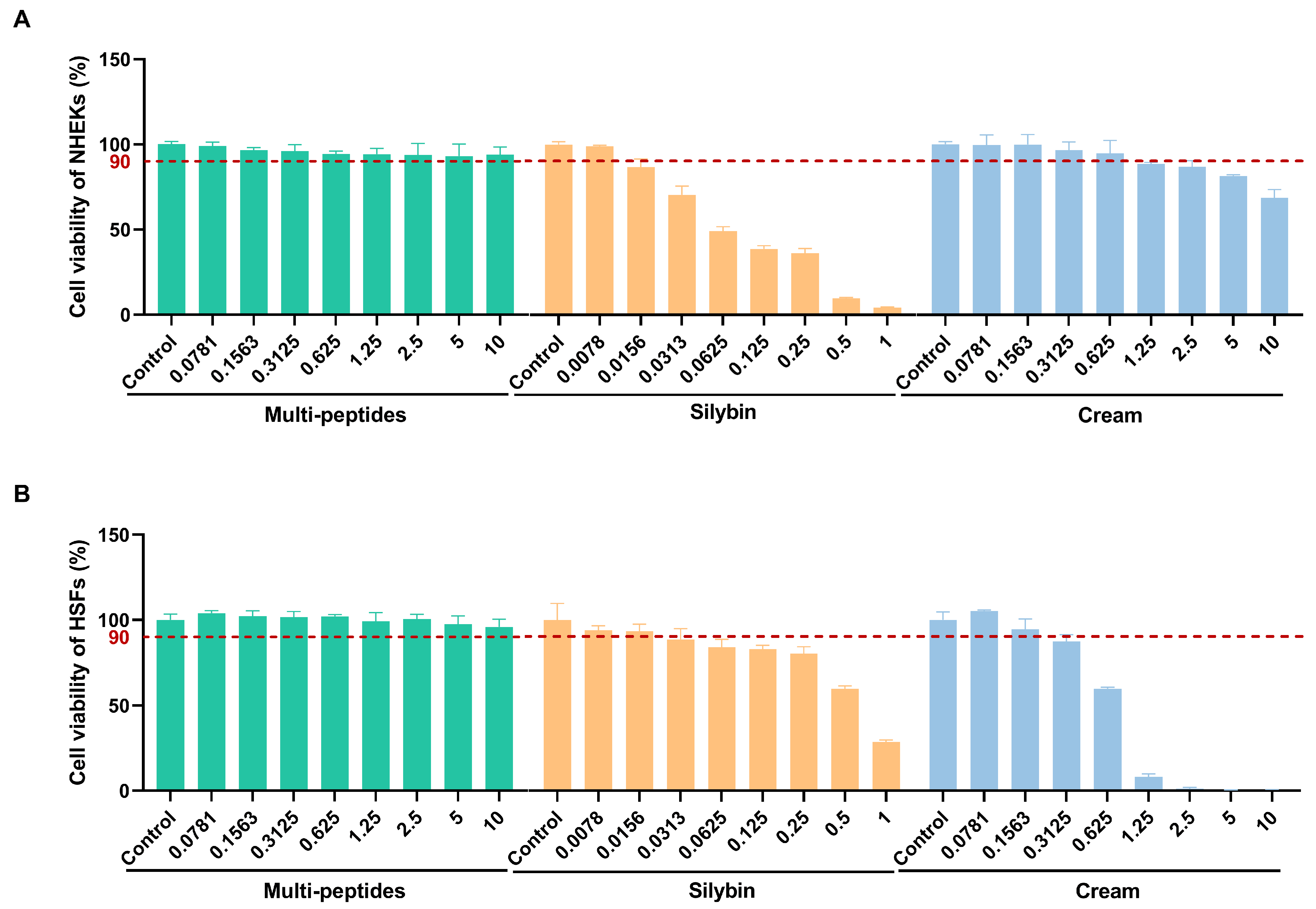 Cell viability exceeding 90% was defined as non-cytotoxic. As illustrated in Figure 1, both NHEKs and HSFs maintained >90% viability with multi-peptides treated across all tested concentrations (0~10 mg/g). Silybin remained non-cytotoxic up to 0.0078 mg/g for NHEKs and 0.0156 mg/g for HSFs, while the cream was non-cytotoxic up to 0.625 mg/g and 0.1563 mg/g, respectively. Based on these results, subsequent experiments were conducted using concentrations within these non-cytotoxic ranges.