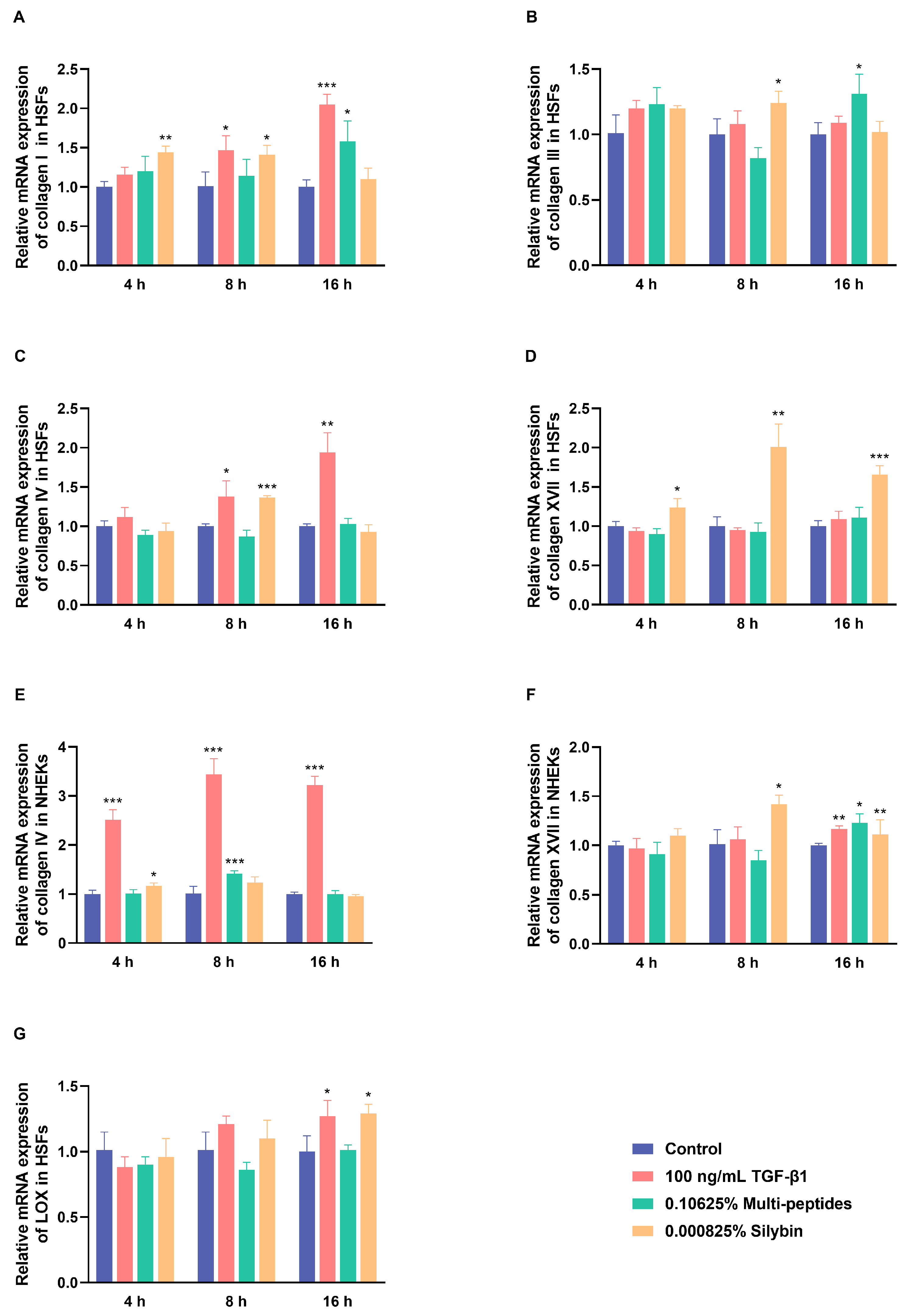 Figure 2. Relative mRNA expression of ECM-related genes (collagen I, III, IV, XVII, and LOX) in HSFs or NHEKs after treatment with multi-peptides or silybin for 4, 8, and 16 h, measured by qRT-PCR. (A–D) The relative mRNA expressions of collagen I, III, IV, and XVII in HSFs. (E,F) The relative mRNA expressions of collagen IV and XVII in NHEKs. (G) The relative mRNA expressions of LOX in HSFs. Experimental group: blue = control, red = 100 ng/mL TGF-β1 (positive control), green = 0.10625% multi-peptides, orange = 0.000825% silybin. Data are presented as mean ± SD (n = 3). Statistical analysis was performed using Student’s t-test versus control at each time point. Statistical significance: * p < 0.05, ** p < 0.01, *** p < 0.001.